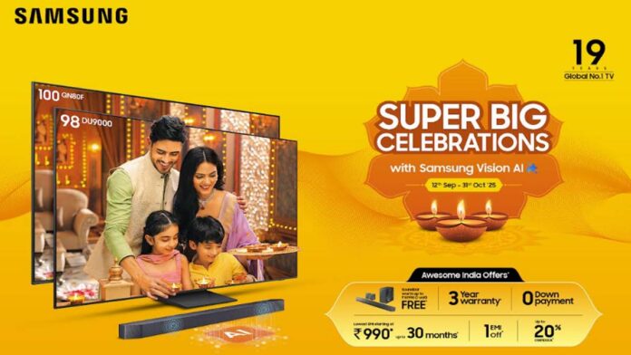 Gurugram: Samsung, India’s largest consumer electronics brand, today announced its biggest festive campaign – ‘Super Big Celebrations’, which brings unmatched deals and rewards on premium big screen TVs that are powered by Vision AI. Valid until October 31, 2025, the campaign provides consumers the opportunity to upgrade their entertainment experience this festive season. Samsung has come up with exclusive offers, cashback, and rewards across its AI TV line-up as part of the campaign. Consumers will also benefit from price drops due to the reduction in GST rates.